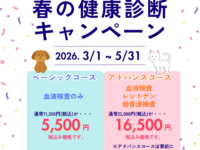 お知らせ 2026年2月25日 春の健康診断キャンペーンのお知らせ 3月〜5月末までの期間限定で春の健康診断キャンペーンを行います🐶🐱🌷今だけの特別価格で健康診断が受けられるのでお気軽にお問い合わせください😊