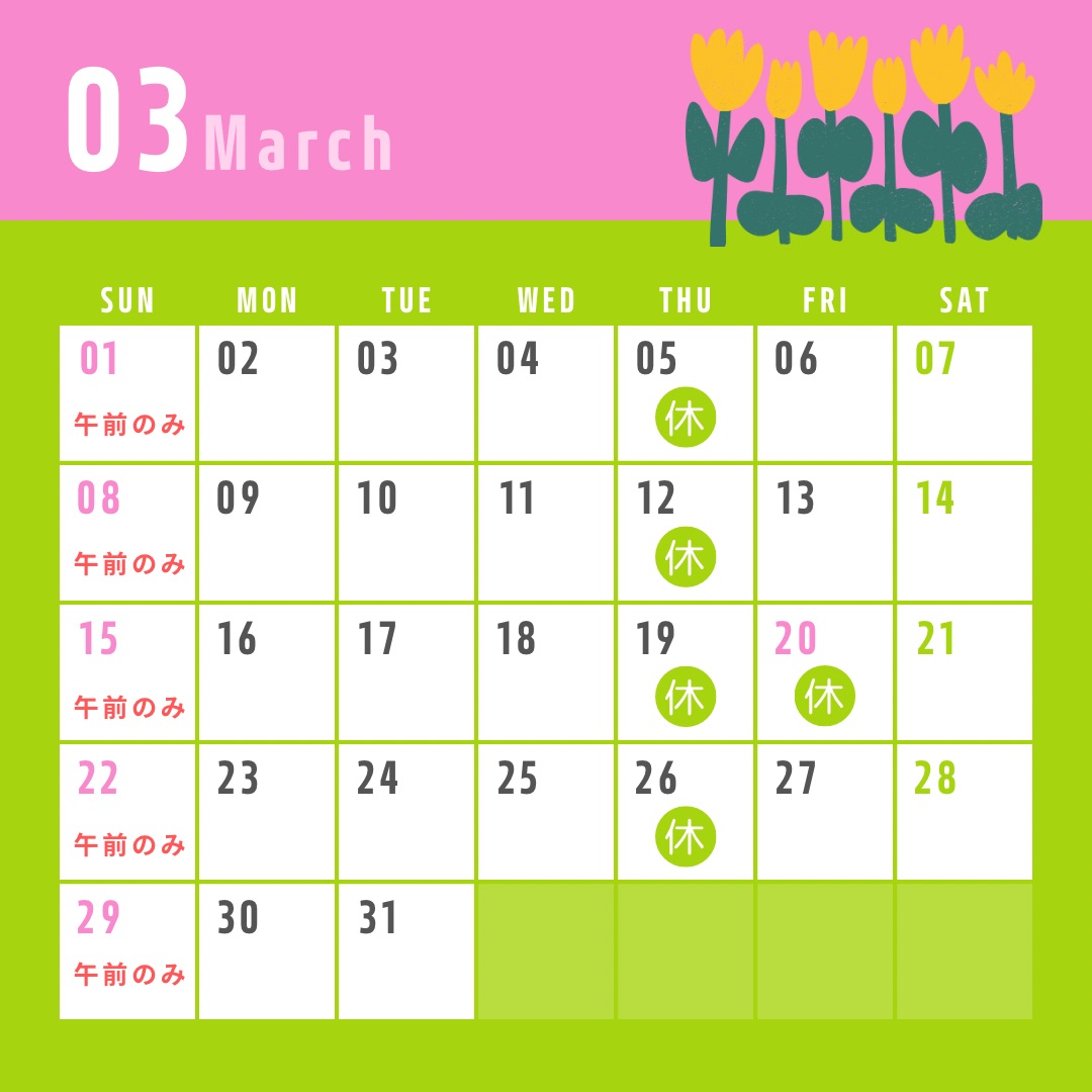 3月診察スケジュールのお知らせ お知らせ 2026年2月22日 こんにちは!太田どうぶつ病院です😊最近は春を感じるあたたかい日も多くなってきましたね☺️朝晩との寒暖差が激しいのが辛いところですが、、、皆様もお身体にお気をつけください💦3月の診察スケジュールのお知らせです📢避妊去勢など手術は予約制となっておりますのでお電話でご相談ください🐶🐱
