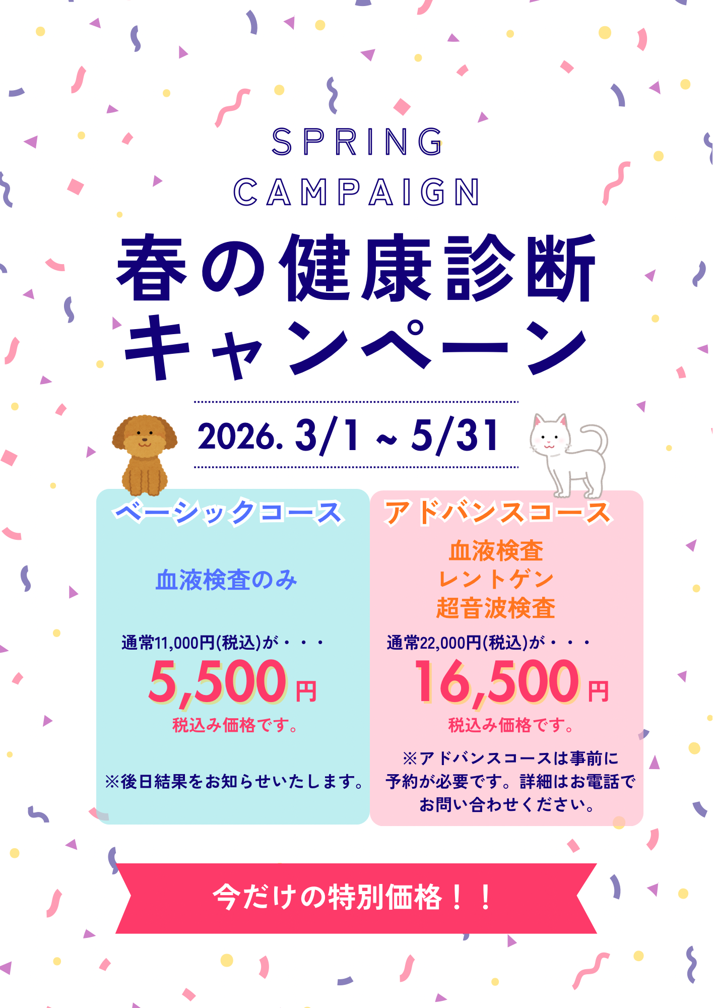 春の健康診断キャンペーンのお知らせ お知らせ 2026年2月25日 3月〜5月末までの期間限定で春の健康診断キャンペーンを行います🐶🐱🌷今だけの特別価格で健康診断が受けられるのでお気軽にお問い合わせください😊